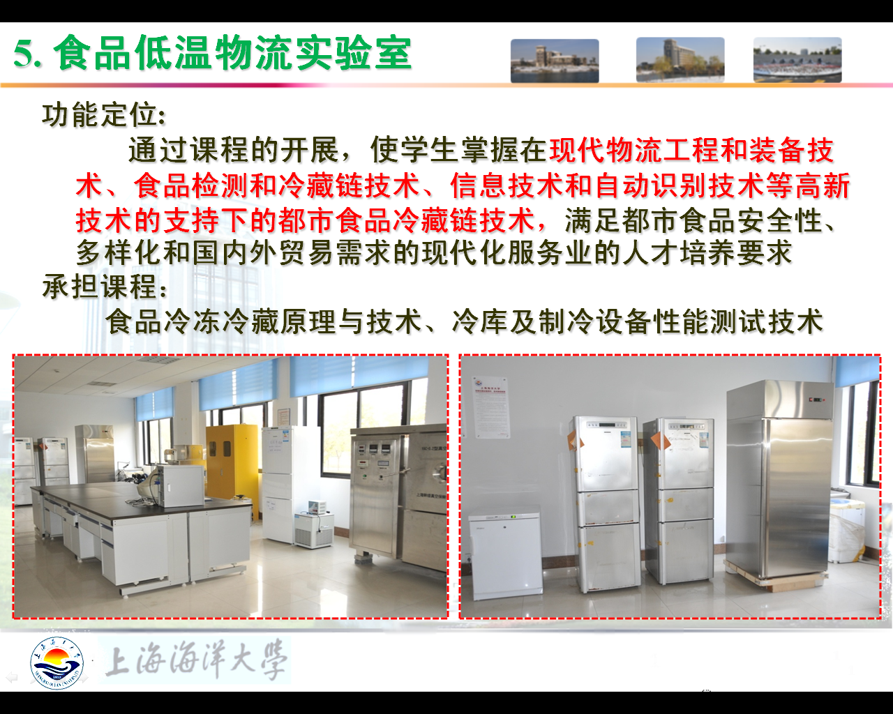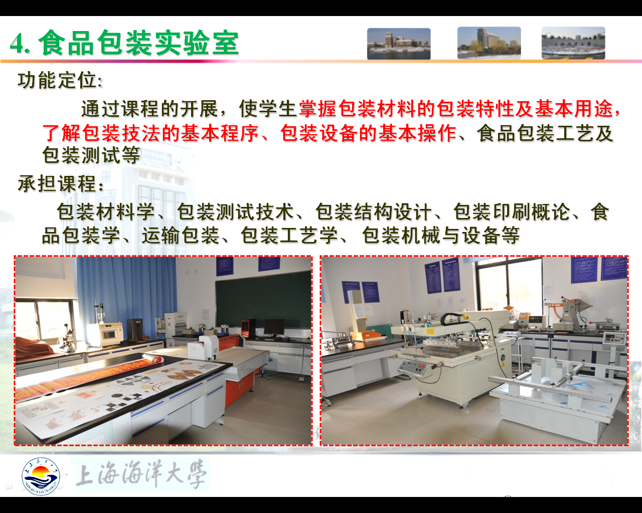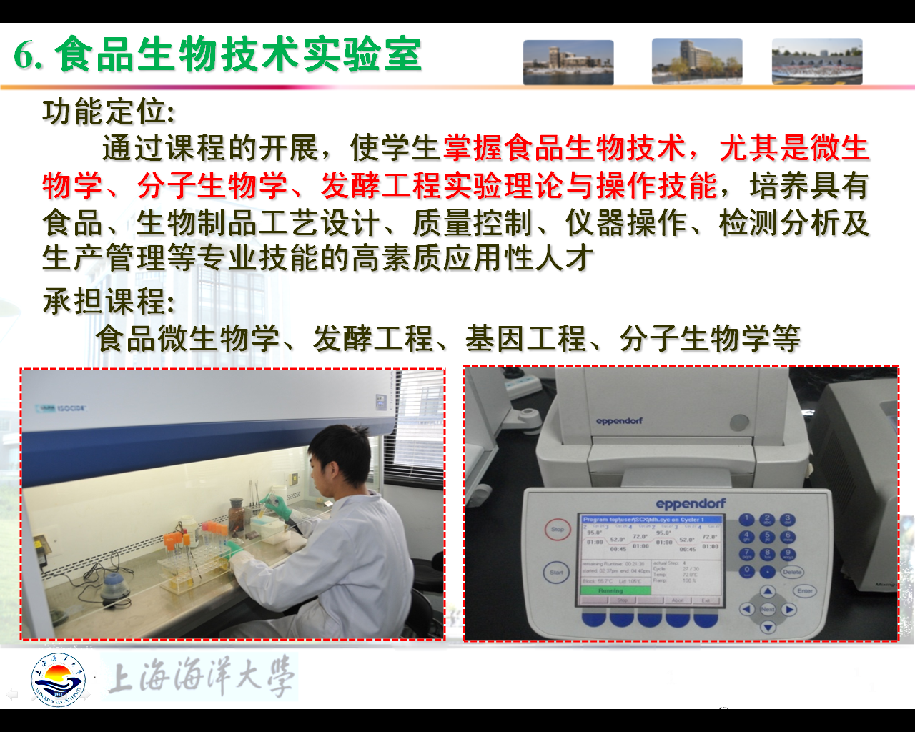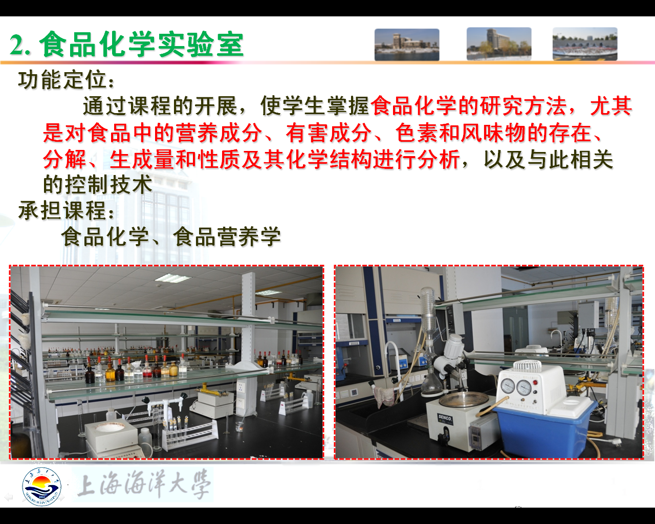 上海海洋大学食品科学与工程实验教学中心是一个面向以食品科学与工程专业为主,同时覆盖食品质量与安全、生物技术(海洋生物制药方向)、(食品)物流工程、(食品)包装工程、食品经济管理等相关专业的本科生和研究生专业实验教学平台。中心前身可溯至水产制造科的实验室,数十年来,中心及其前身注重食品科学与工程的实验教学,在学科发展的不同历史时期,按照理论和实践相结合的客观要求,及时调整实验教学方式和教学内容,为国家培养了一大批食品科学与工程的优秀人才。