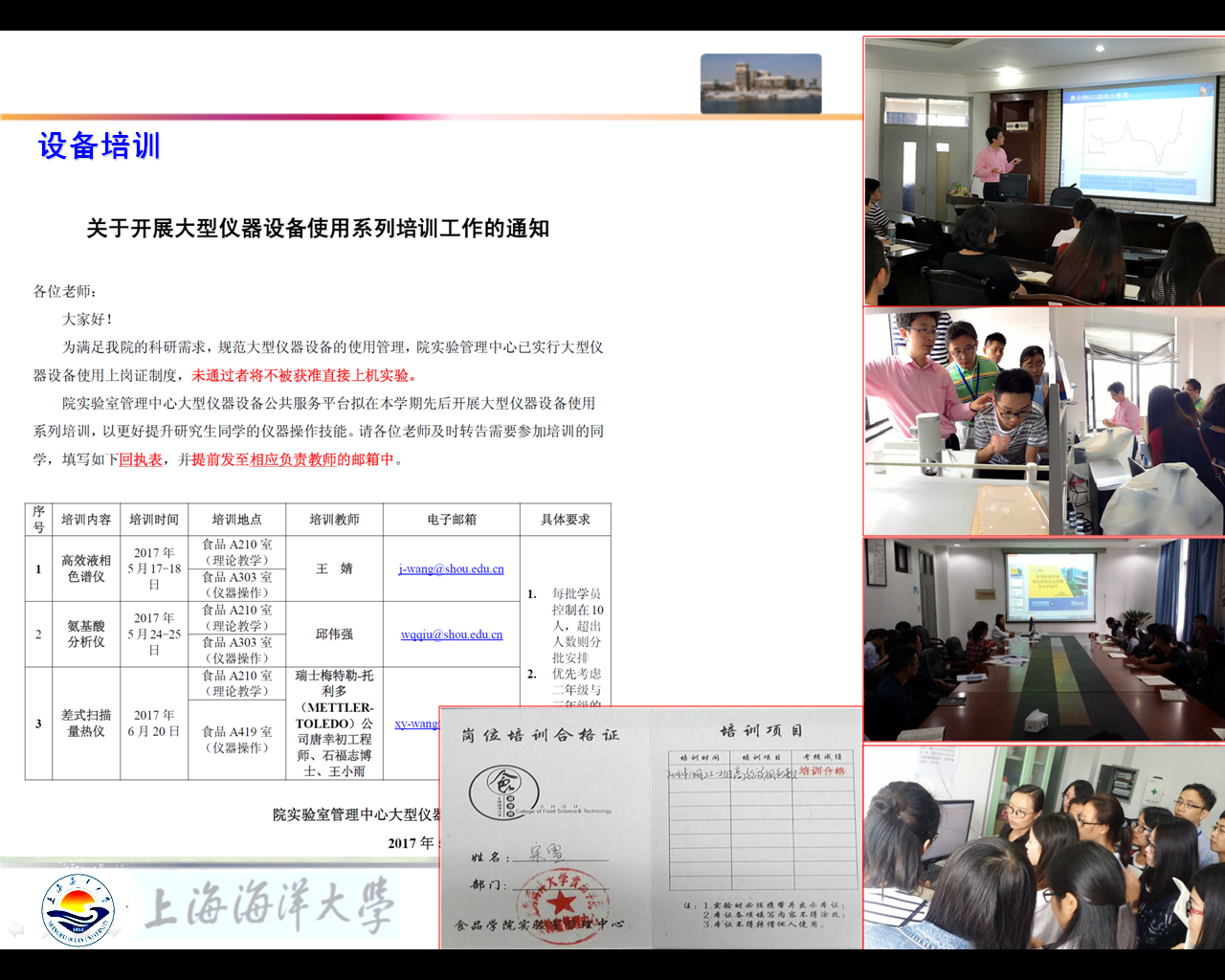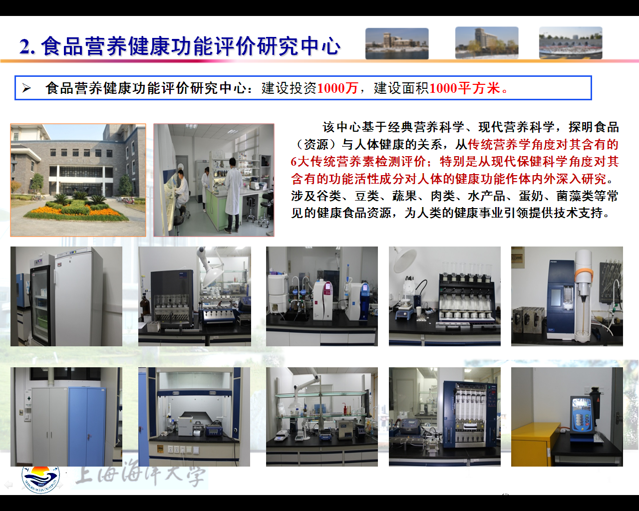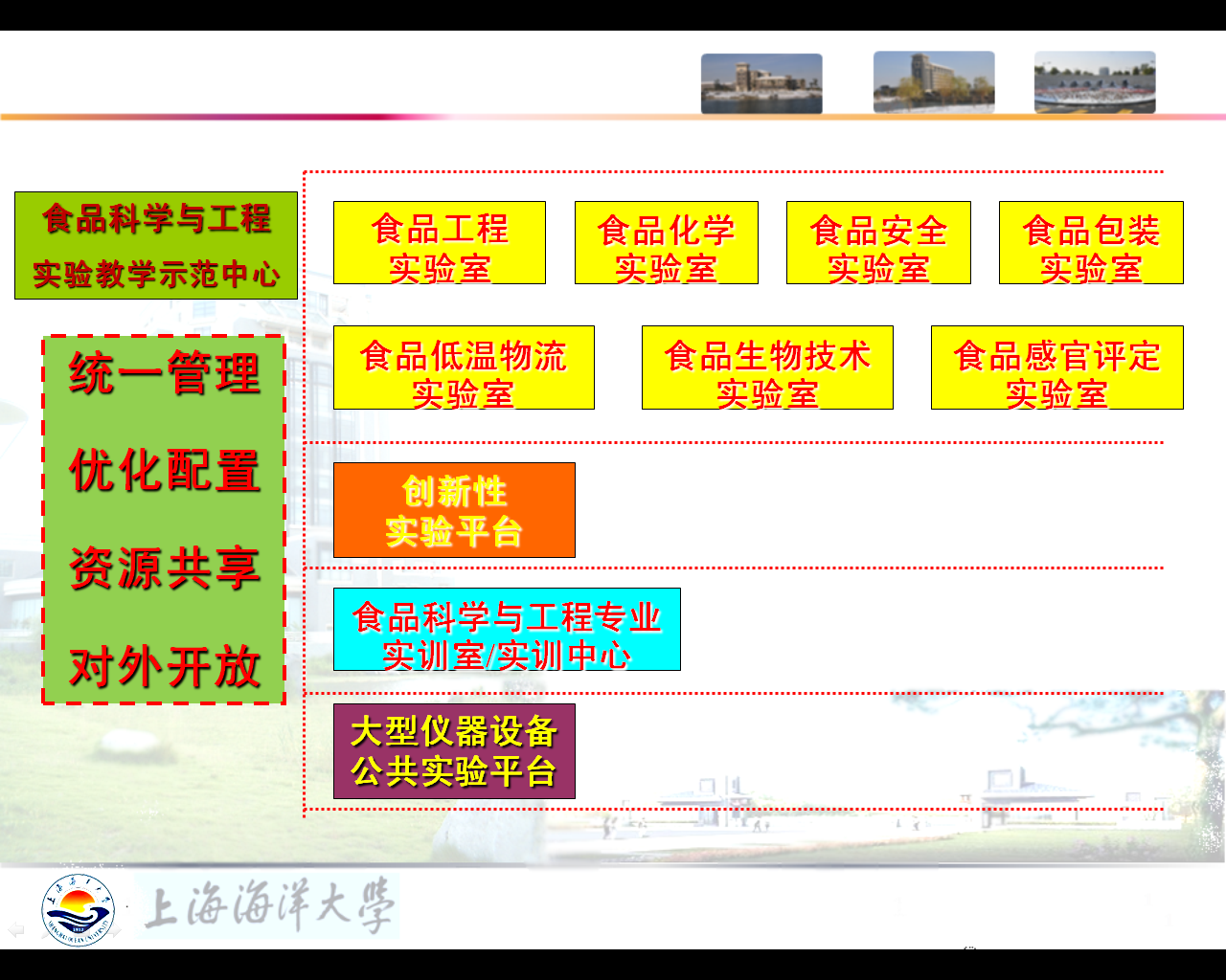 2000年学校部市共建归属上海市,面临高等教育的扩招,在办学条件趋于明显紧张的形势下,学校依靠地方政府和自身财力加大了对实验室的投入,学校将食品科学与工程实验教学中心划为食品学院与校实验管理中心共同管理,同时根据学校各专业人才培养的要求,对教学资源进行了整合,2005年投入38万元扩建食品包装实验室,投入71万建设食品安全实验室;2006年投入40万元补充扩建了食品工艺实训室;2005年~2007年三年间,中心利用市重点学科资助资金600余万元,改建了大型精密仪器室,新购置5万元以上仪器31台(套),其中进口大型仪器27台(套),组建了中心公用实验平台。2007年又投入200万用于食品化学、食品安全实验室建设,2008年投资28万元改建食品工程原理实验室,同年年底又投入1000万元给中心公用实验平台,用于购置实验仪器设备,目前已陆续到货验收;此外,2008年学校还专门投入实验室建设经费255万元,用于本科实验教学实验方法的更新。目前食品科学与工程实验中心下属有食品工程实验室、食品化学实验室、食品安全实验室、食品包装实验室、食品低温物流实验室、食品生物技术实验室、食品感官评定实验室等7个教学实验室,1个创新性实验平台及1个食品科学与工程专业实训室,包含鱼(肉)制品生产实习、焙烤食品生产实习、乳品(果汁)生产实习、食品包装及水产品加工综合利用生产实习等。