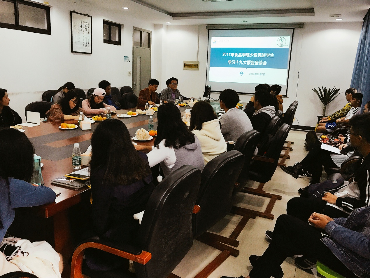 为深入贯彻学习党的十九大精神,鼓舞少数民族学生坚定信念跟党走,提升自信心和自豪感,食品学院于11月7日下午2:30在A209召开少数民族学生学习十九大报告座谈会。