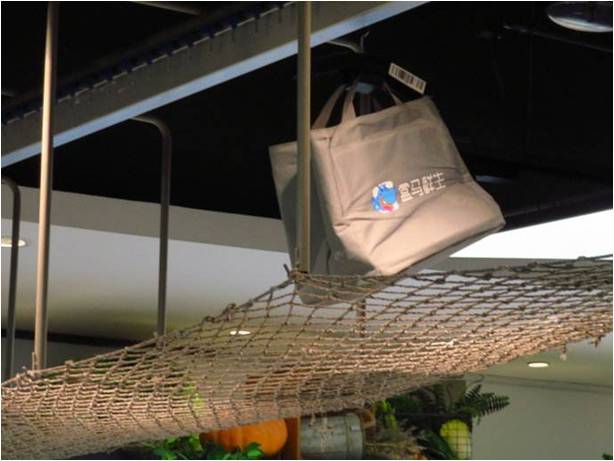 在走访过程中,调研组同学发现,不同于本来生活,盒马鲜生在配送方面,更看重时间和速度,用速度来保证生鲜出库后的最佳品质。通过“店仓一体化”门店的工作人员介绍,盒马鲜生的配送时间很大程度上得益于“头顶的转运系统”,即链式转运系统。超市工作人员接到App订单后,经后台整合打散订单,取货员根据所负责的取货区域直接于超市内取货打包,通过系统将选好的货品送进负责仓储和物流配送的后仓,在那里整合打包,这个过程,要求在3分钟内完成。货品通过物流系统最终到达快递员手中时,已完成三重保险模式,外有灰色泡沫保温箱,内含冰袋以及纸箱,保温箱以及冰袋均为循环利用产品。整个完整的物流体系,保证了消费者下单后,30分钟取到货品的高端消费体验。