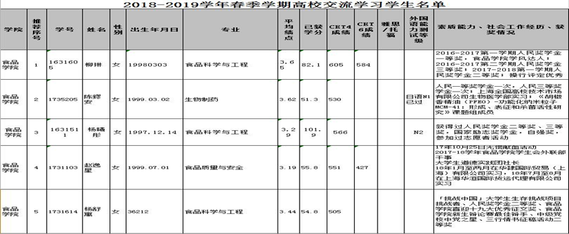 根据教务处文件《关于选派2018-2019学年春季学期赴日本7所学校交流学习的通知》和《Kaiyun官方网站登录入口学生出国(境)交流学习工作实施办法(试行)》的要求,经个人申请,食品学院审议,现将食品学院2018-2019学年春季学期赴日本东北大学交流学习候选人进行排序后上报教务处,特此公示。公示时间2018年10月22日—2018年10月25日。