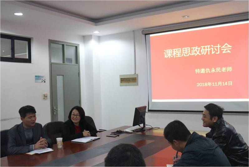 仇老师对课程思政的内涵做了简要概括, 明确思想政治教育目标,在立足学科的学术内涵和传承脉络的基础上,发挥专业课程本身的特色,将政治认同、国家意识、文化自信、公民人格等要素恰到好处地融入到课堂教学中。随后大家展开了热烈地讨论,课程建设的老师们汇报了开展课程思政的教育内容以及做法,希望通过课程思政达到既为学生的知识学习传道授业,又为学生的人生成长指引航向。对部分老师提出的疑惑以及在课堂上碰到的问题仇老师也作了一一解答。