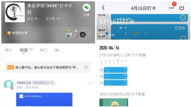作为自习室打卡活动的组织者,来自18级建筑1班的苏洁同学认为,同学们线上课程结束后常常会“不知去向”,作为一名团学骨干的她希望能够通过线上自习室的方式,督促同学们更好地在课后自我巩固。从两周的进展来看,参与的同学们积极性很高,大家一起互相监督认真自习,按时参与打卡。在这个特殊时期,能帮助到他人让苏洁觉得非常有成就感。来自19包装1班的朱耘颖同学最初抱着试一试的心态参加了自习室打卡活动,希望借此机会给自己的学习增加些紧迫感。现在经过几次的晚间打卡,她发现这样“锁手机”式的打卡活动给她更多的时间去独立学习、思考,借助这个平台,培养了自己“慎独”的习惯,也结识了不少自控率优秀的同学,这是一个向同学学习的好机会。