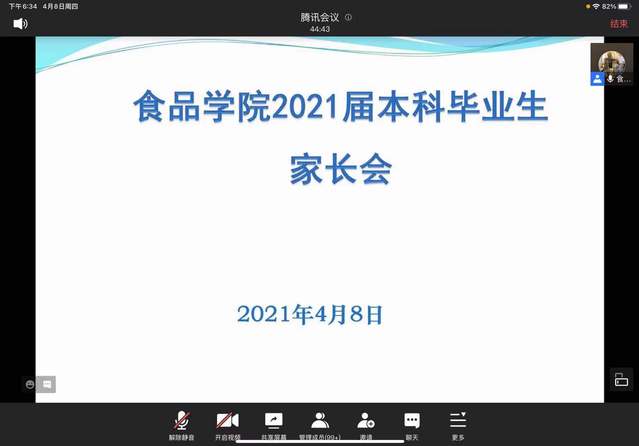 4月8日晚,食品学院2021届本科毕业生家长会在腾讯会议上召开。食品学院党委副书记孙红刚,学院就业指导员邓高燕、岳铭,毕业班辅导员矫璐蔚、任芳等老师及2021届本科毕业生家长共同出席了此次会议。