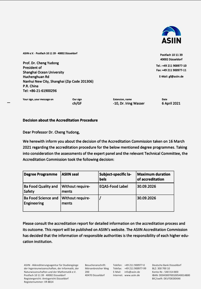 欧洲ASIIN本科认证是我校食品科学与工程专业继美国IFT工程认证之后通过的第二个国际认证,代表着我校专业建设在标准化、规范化、国际化取得长足进步,也是对我校人才培养模式和人才培养条件的充分认可。