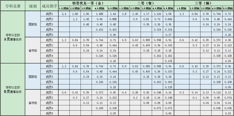 以团队获得奖励荣誉的,按照贡献度依次计算绩点,各成员绩点分配比例见附表3。