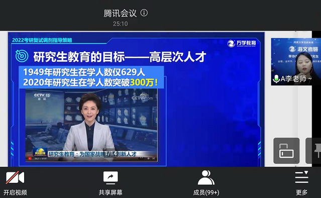 自2月21日开始,2022届考研学生的初试成绩陆续公布,为做好考研学生的指导服务工作食品学院于2月24日下午13:00举办2022届毕业生考研复试及调剂线上指导会,给考研学生提供全面复试及调剂指导。本次会议由食品学院就业指导员邓高燕老师主持,李蓬勃老师主讲会议吸引到100多位同学参加