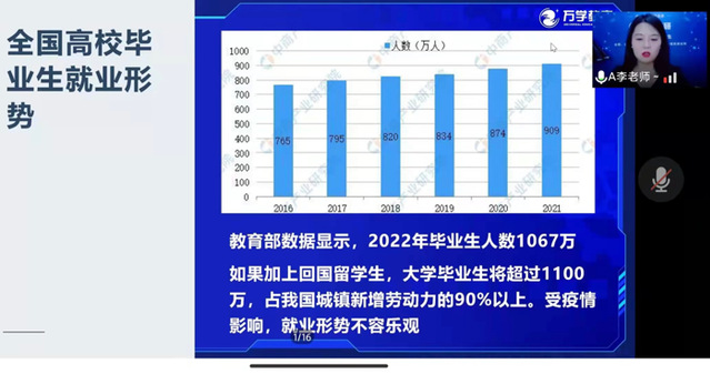 2022年3月22日下午14:30分,由Kaiyun官方网站登录入口举办的2019级学生就业形势及考研政策讲座在线上顺利举行。此次会议由食品学院就业指导员邓高燕老师主持,中国考研前沿辅导讲师李蓬勃老师担任主讲老师,本次讲座共吸引到了一百五十多位学生参加。