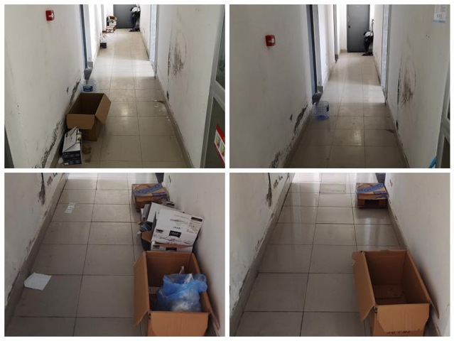 各楼层在整理宿舍垃圾后,依次将其运送至一楼门厅,临时党支部副书记李杰和党小组组长刘源两位老师对各类垃圾进行检查、打包后运送至垃圾清运通道,由小区消杀负责人罗阿姨进行消杀后转运出小区,在各项环节上确保落实疫情防控要求,科学防疫,守护师生健康。