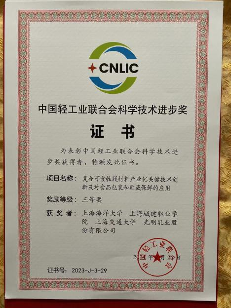 由上海海洋大学周然副教授牵头,联合上海城建职业学院、上海交通大学、光明乳业股份有限公司完成的“复合可食性膜材料产业化关键技术创新及对食品包装和贮藏保鲜的应用”项目,获得“中国轻工业联合会科技进步三等奖”。本成果是申请人在国家自然科学基金及上海教委创新资金等多项省部级项目的支持下,有效地解决了在食品保鲜领域中,可食性膜性能和活性物质缓释技术的难题,推进了可食性膜的应用。