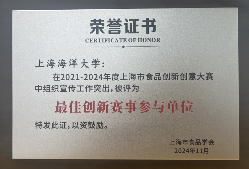 1129上海市食品学会举办的第九届会员代表大会第一次会议表彰了学会优秀单位,我校2021-2024年度最佳创新赛事参与单位”。